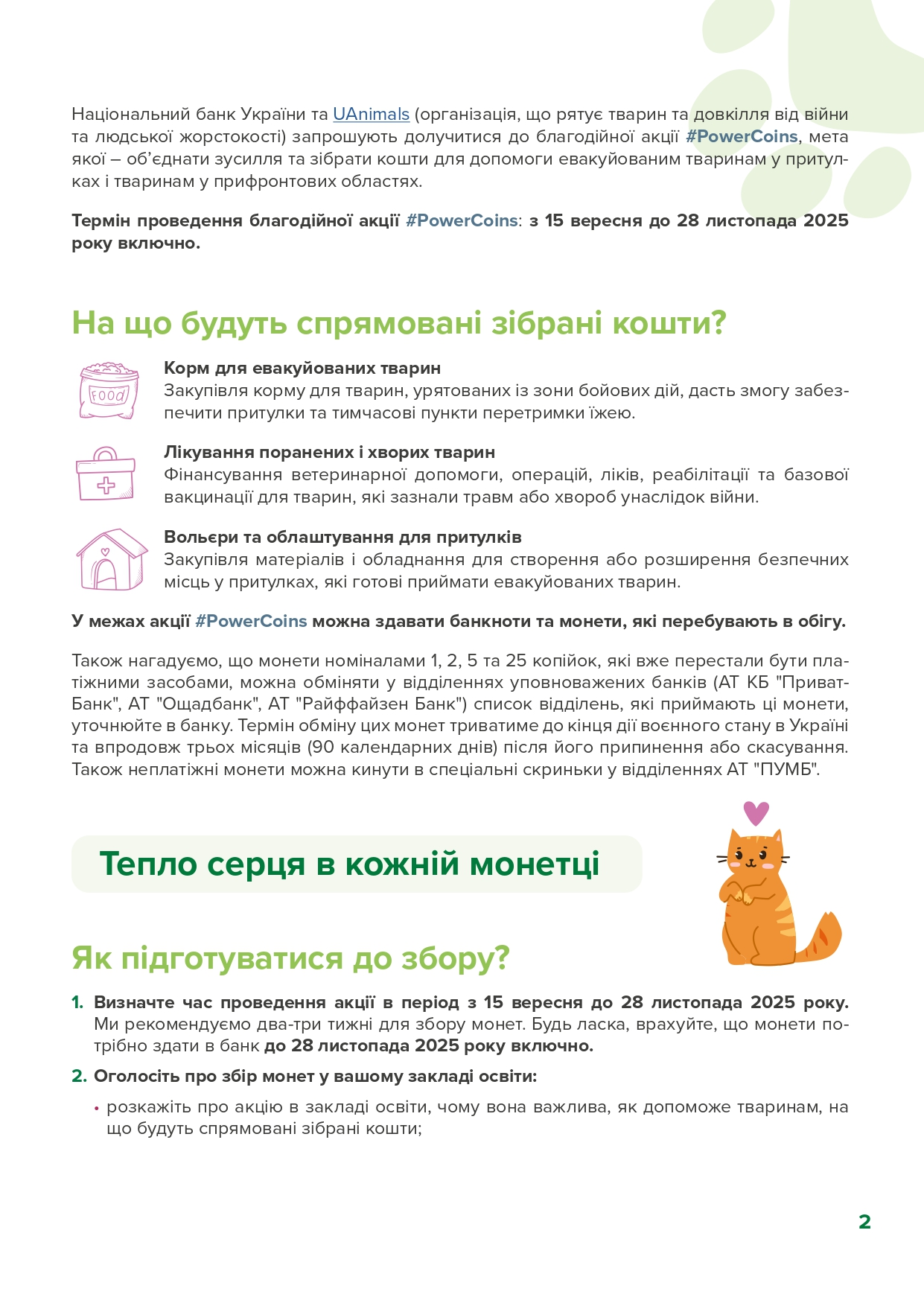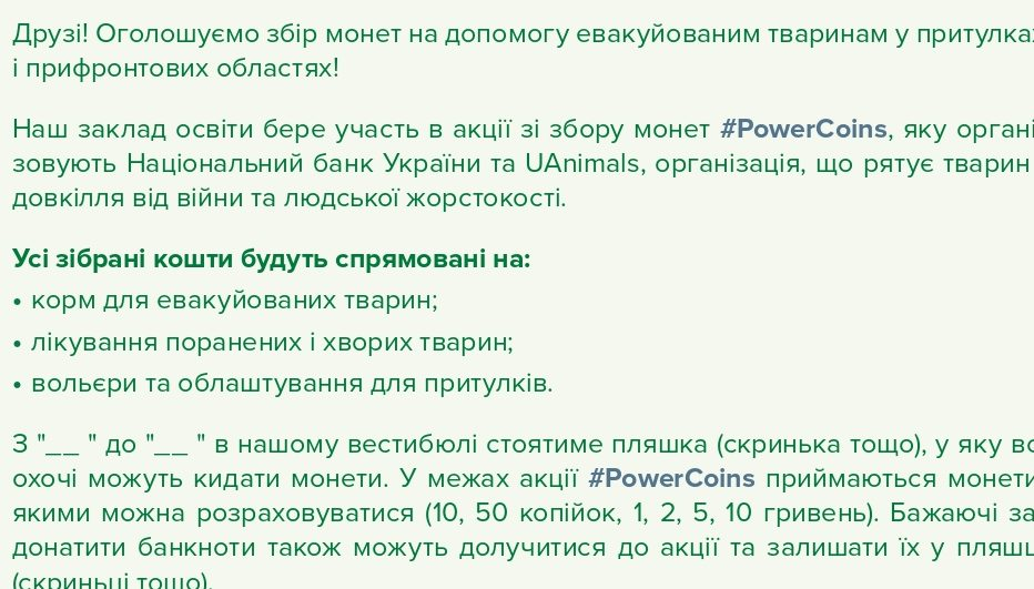 У Леб’язькій філії КЗ “Зачепилівський ліцей ” проходить акція “Тепло серця в кожній монеті” збір монет для допомоги тваринам, які постраджали від війни з 15 вересня по 15 жовтня 2025 року. У вестибюлі буде стояти скринька у яку всі охочі зможуть кидати монети.
