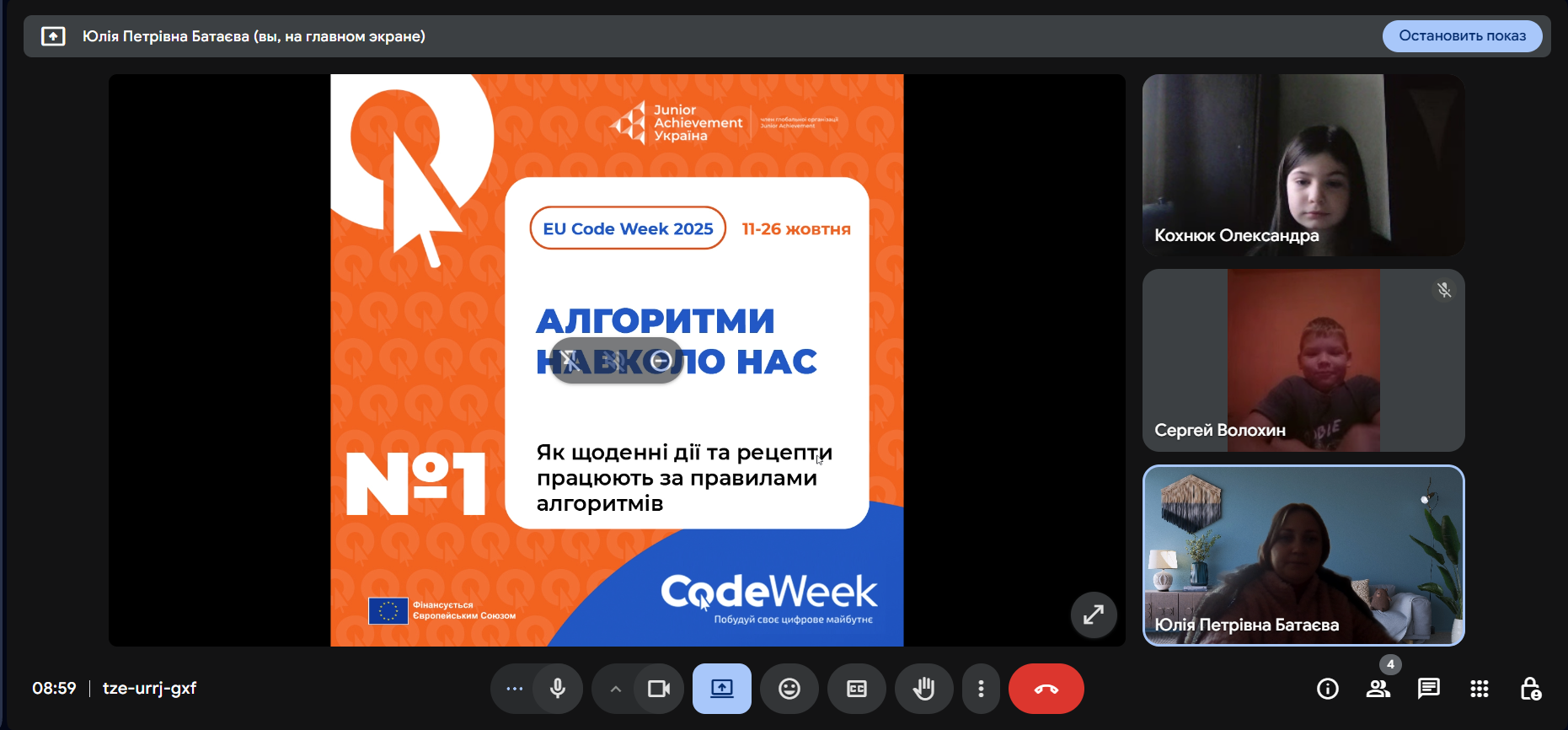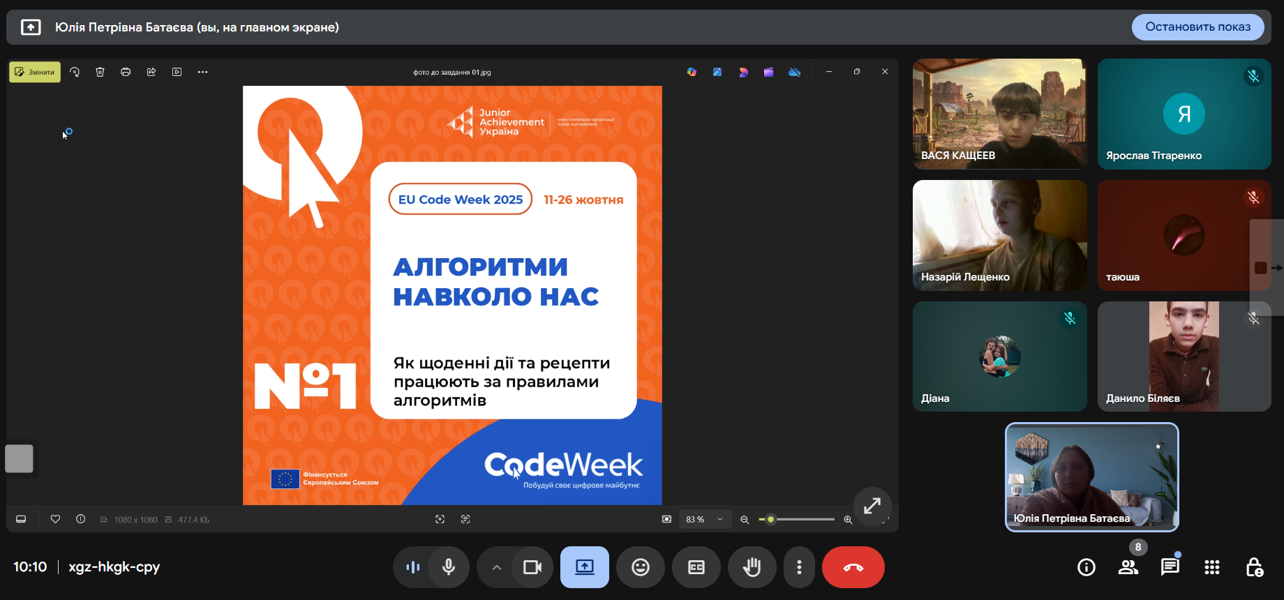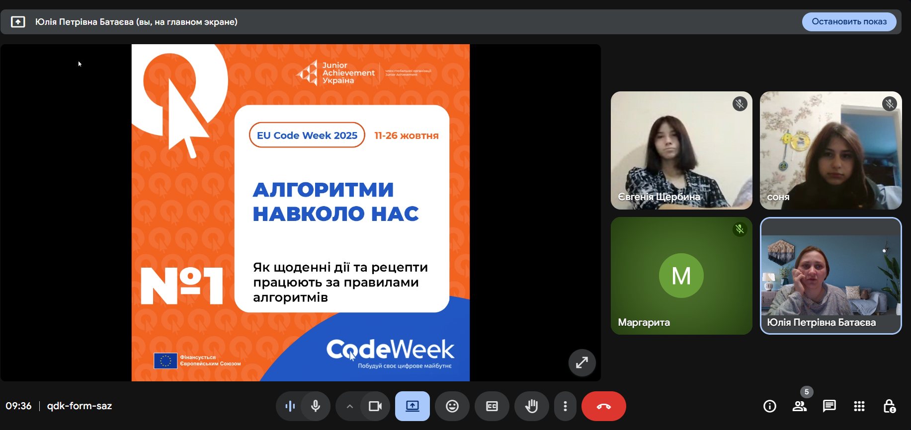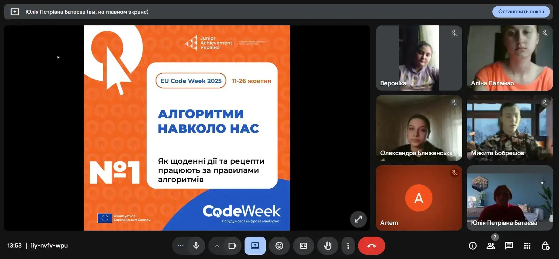 Під час заходу «Алгоритми навколо нас: мислимо як програмісти» учасники дізналися, що алгоритми — це не лише частина комп’ютерних програм, а й невід’ємна частина нашого щоденного життя. Розглянули прості приклади алгоритмів — від приготування страв за рецептом до маршруту шкільного автобуса чи сортування речей у шафі. Учасники спробували самостійно скласти власні алгоритми для повсякденних завдань і зрозуміють, як мислить програміст, коли розв’язує проблему крок за кроком.